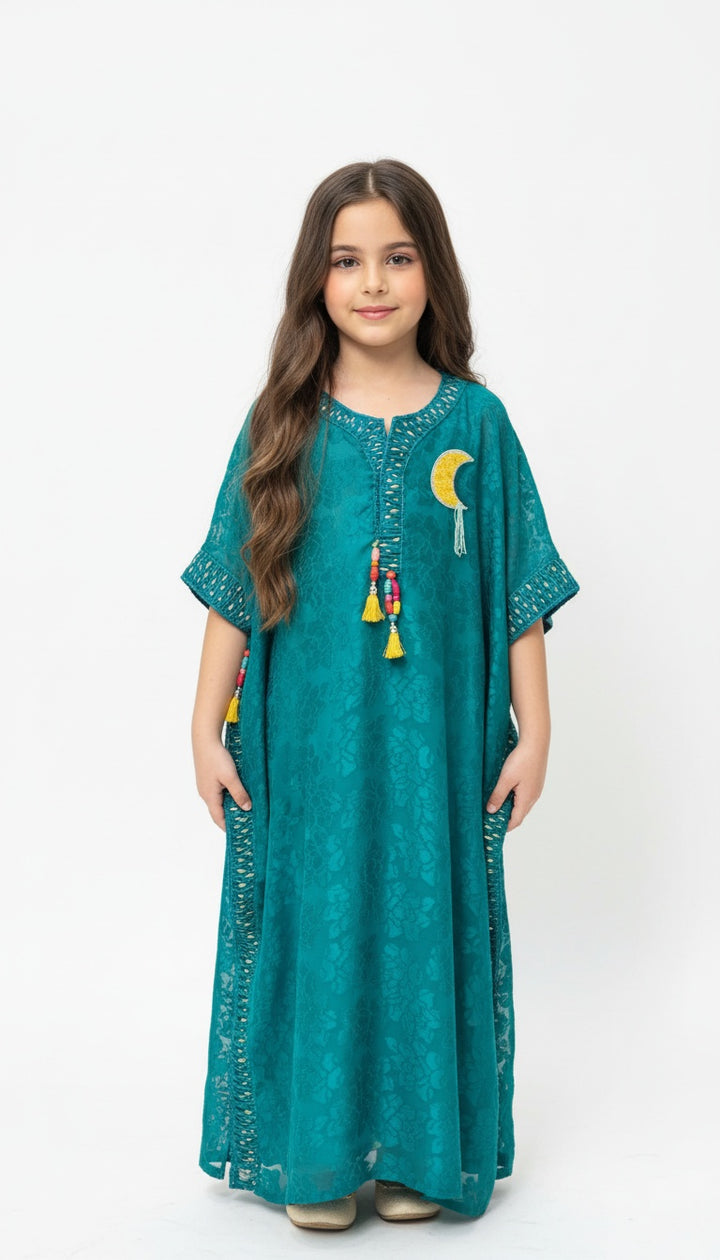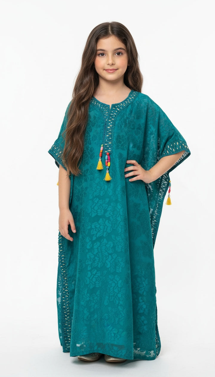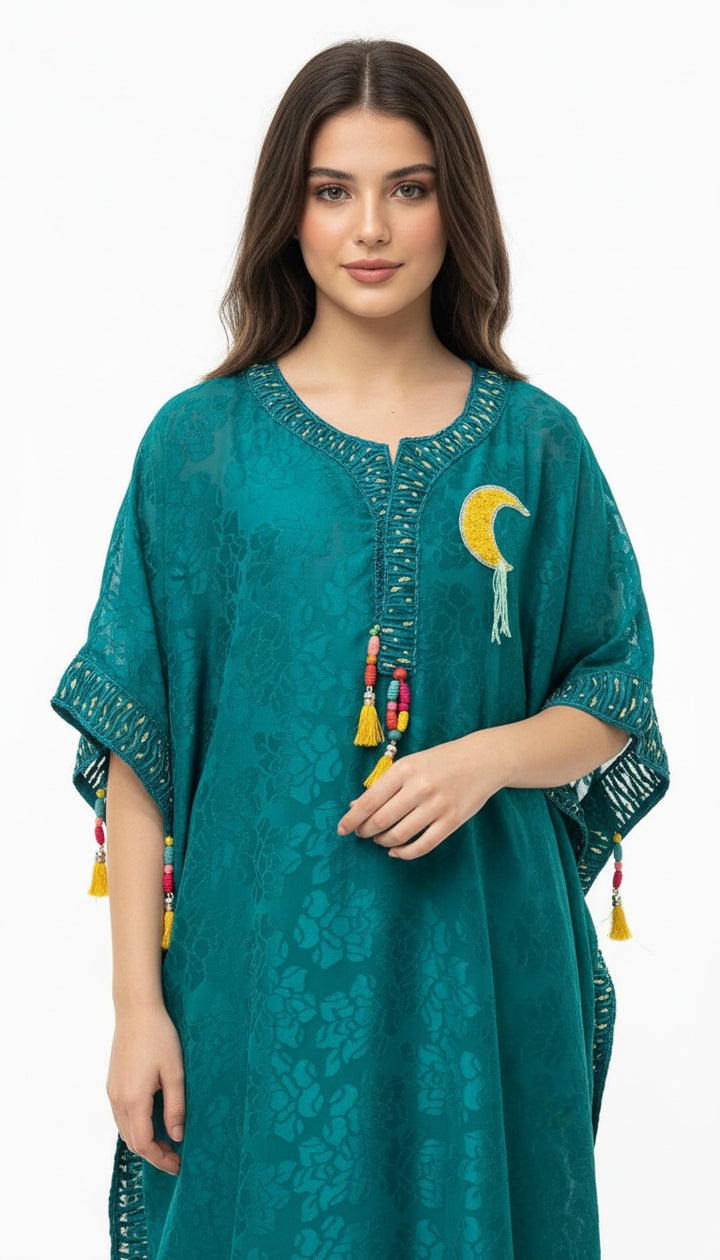 جلابيه فراشه من حرير شيفون مع تطريز يدوي لكامل اطراف الجلابيه واكسسوارات جميله على الصدر