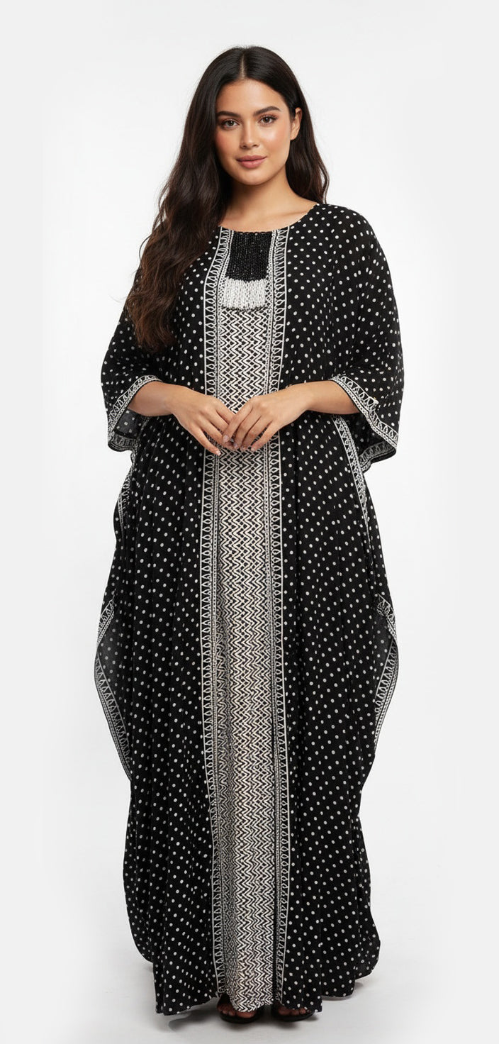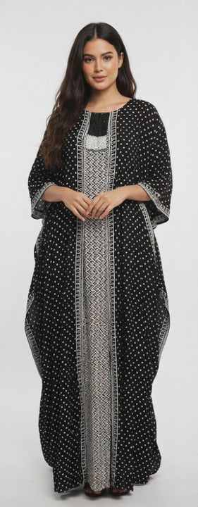 جلابيه من الحرير المطعم الياباني بقطن مع شك على شكل هدب عند فتحة الرقبه وسكارف منفصل مشكوك فيه اطرافه