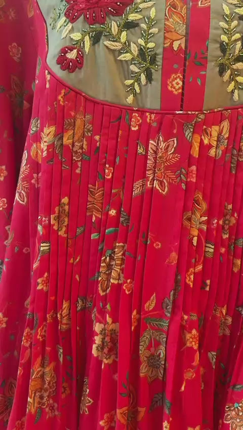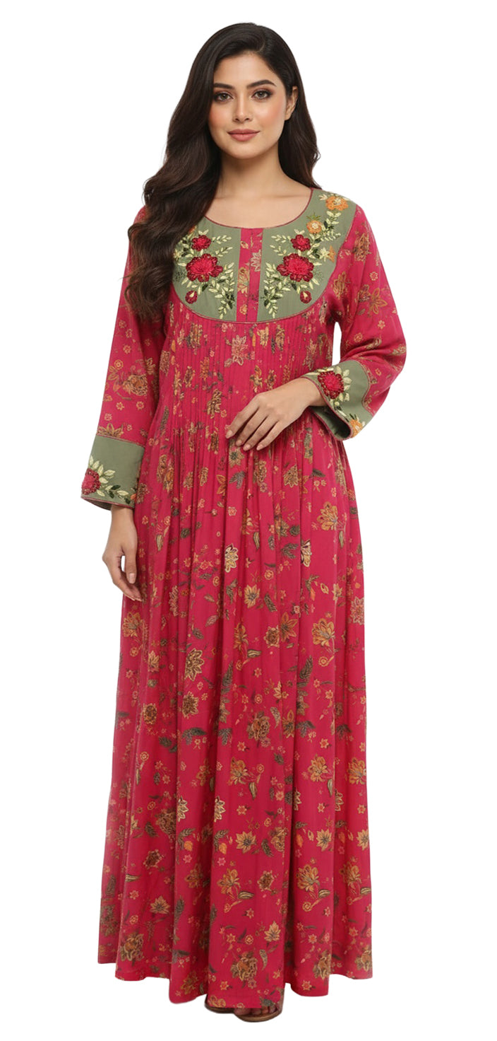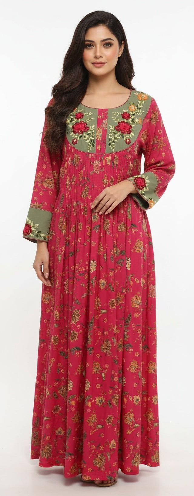 جلابيه من قماش الليبرتي مع قماش قطني ساده مشغول يدوياً بخيوط تطريز وجيب ثوري في اليد والصدر