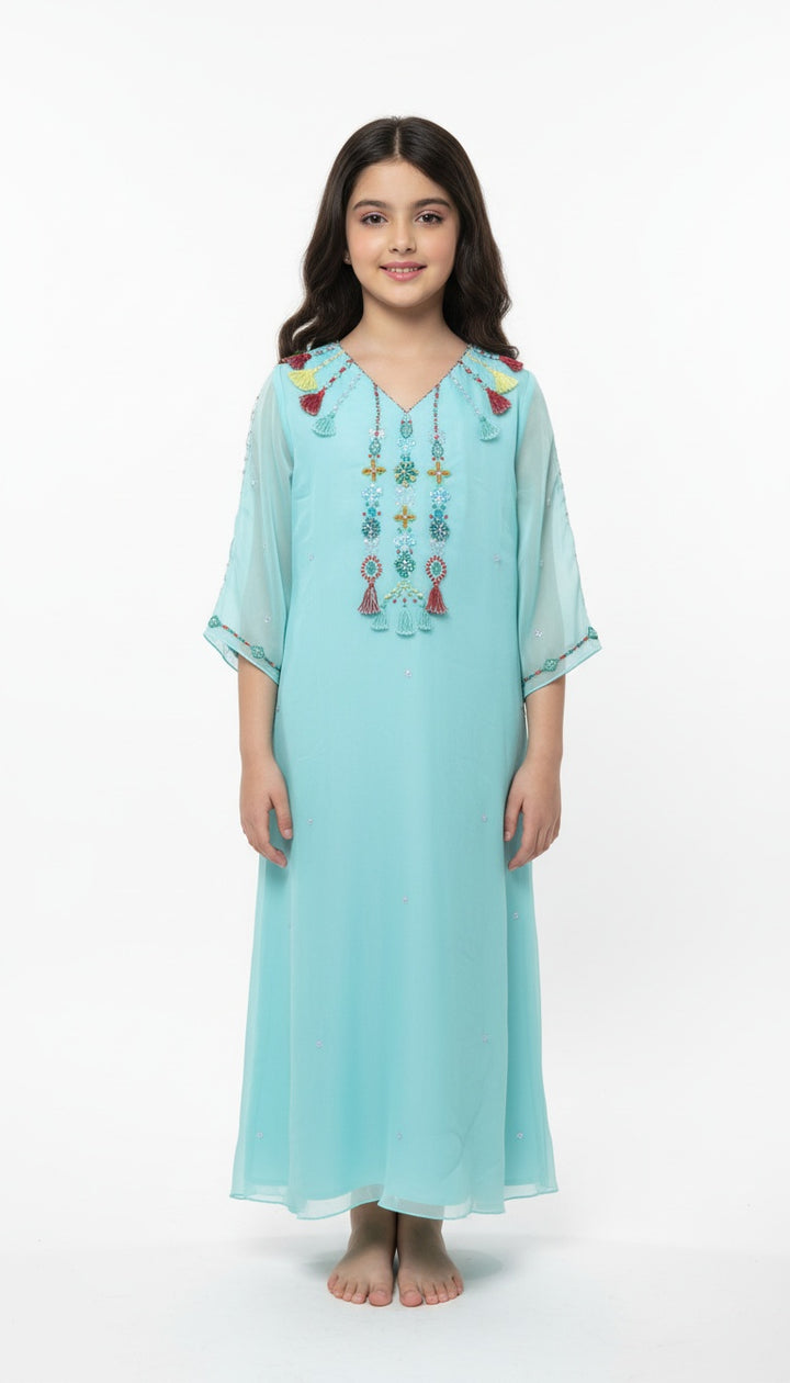 دراعه من الارجنزا التركواز الازرق المشغولية بخيوط واحجار الشك صنعت بدقه واتقان مع منثور الشك على كامل الدراعه