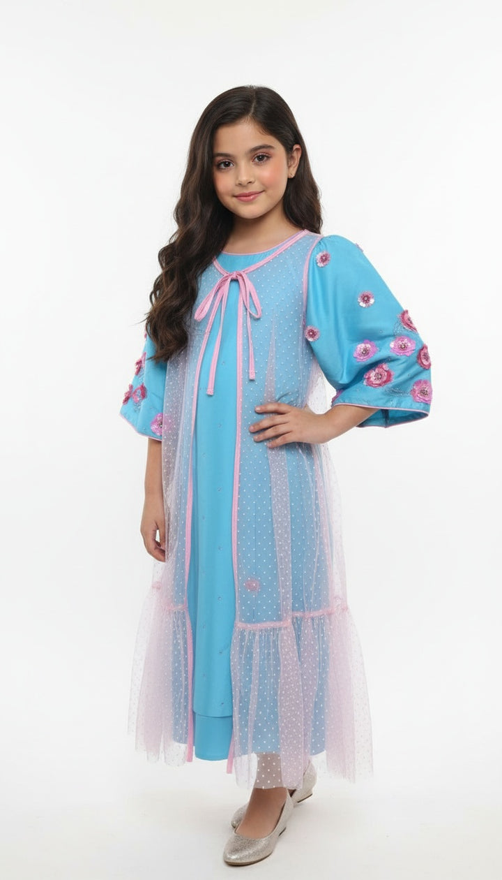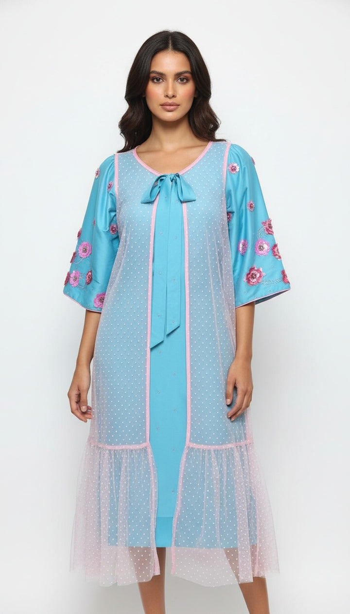 دراعه من التفتا الازرق شكوكيا على شكل ازهار متفرقه ومن الاعلى قطعه من التول سباك وردي وربطه شوكة بها ثور من الشك في الهواء الطلق