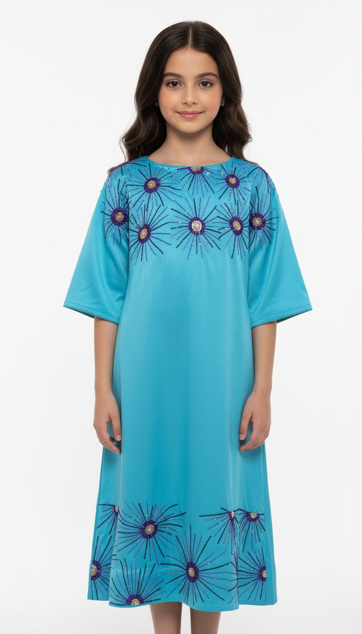 دراه من التفتا الازرق مع شكيلي باللون البنفسجي والذهبي على الصدر وحواشي