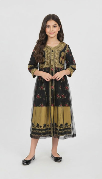 فستان مطرز بالاسودصفر وورود الشال الشعبيه من قماش الكريب المبدع مع تول اسود ستايل خليجي جميل