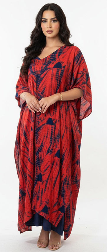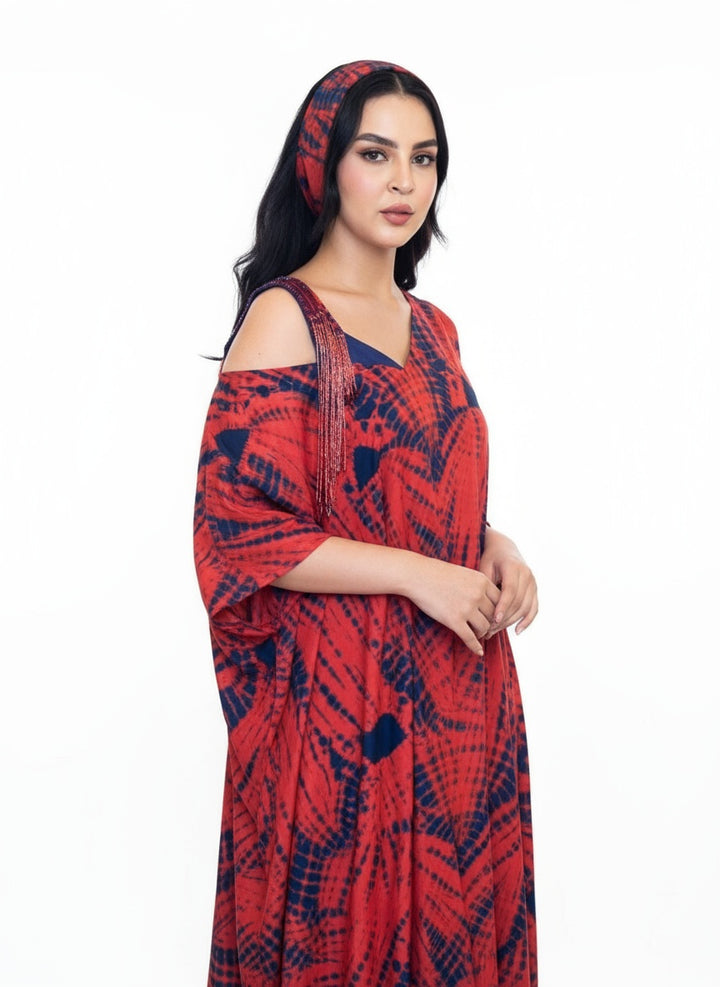 فستانه من 3 قطع بطانه كحلي عريض احمر وكحلي وعلى احد الاكتاف شك مع حيوط الشك من الامام والخلف مع سكارف مع خيوط الشك من القماش الياباني المطعم بالقطن