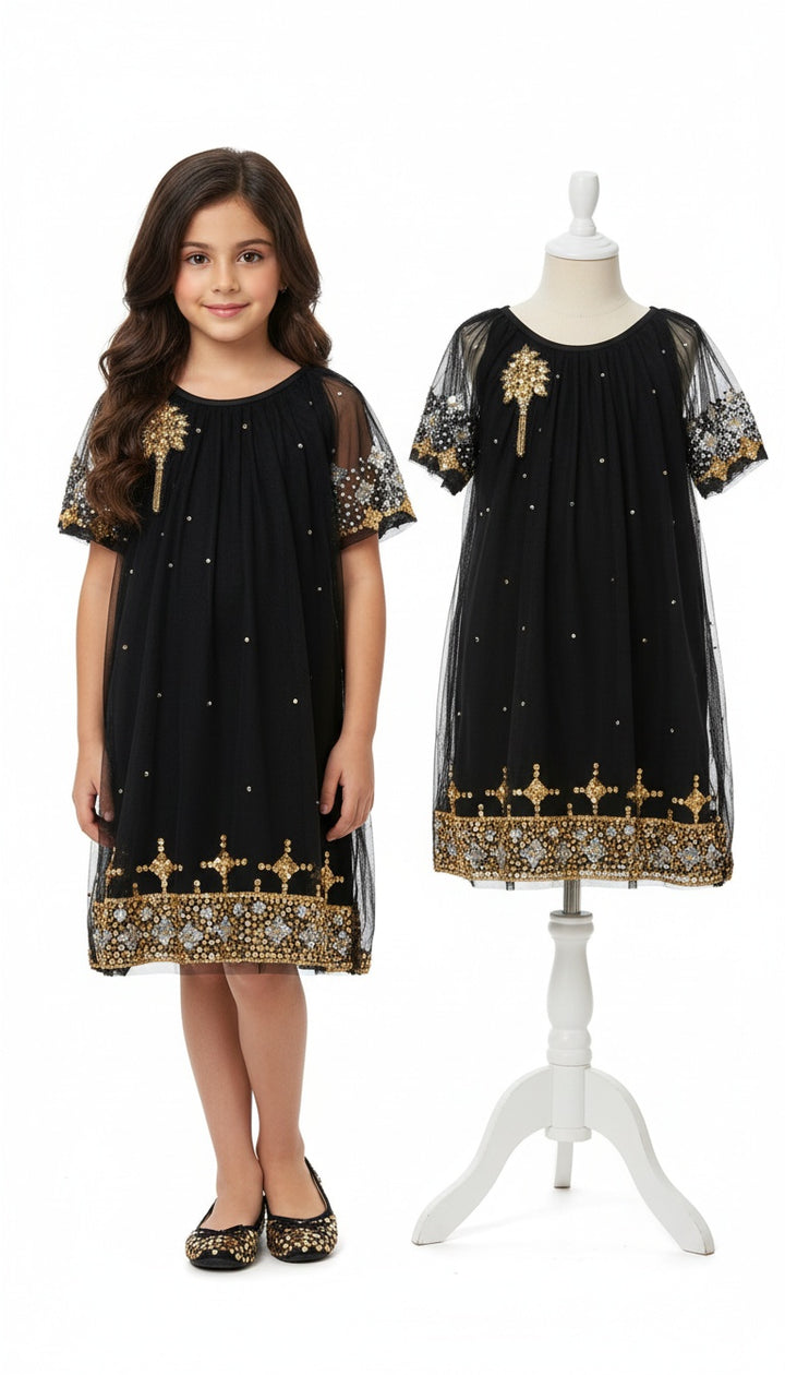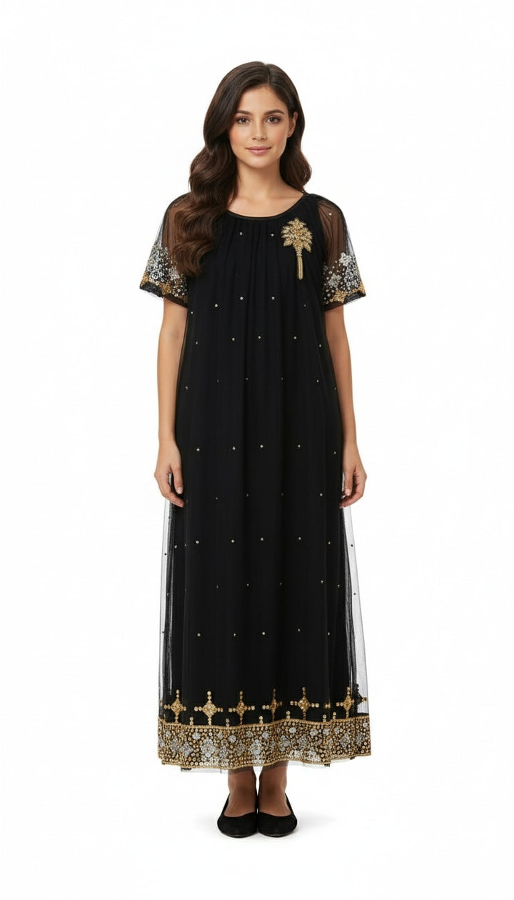 فستان من التول الاسود المشكوك فيه كاملا ب الخليجيه وعربيه مع تصميم المرود على الصدر واكسسوار خاص بالتطريز المرود رائع جدا لمناسباتكم الخاصة