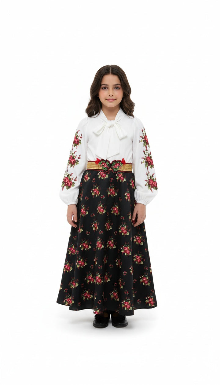 طقم : بلوزه مطرزة باللون الأسود من الكريب خفيفة في اليد مع استان قطني مطبوع عليها بور الشال وحزام منفصل بشكل منفصل
