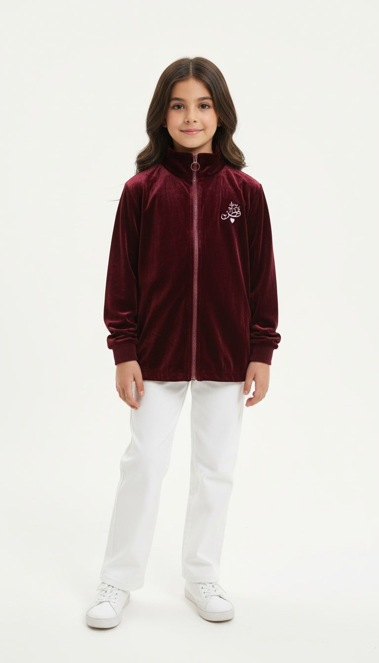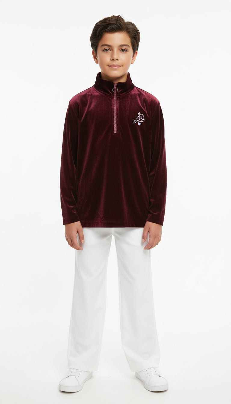 بلوفر قطر من المخمل العنابي المبطن باللون الاسود ومطرز بالفضي من الامام والخلف