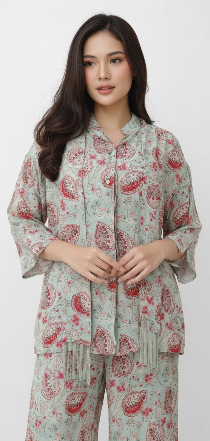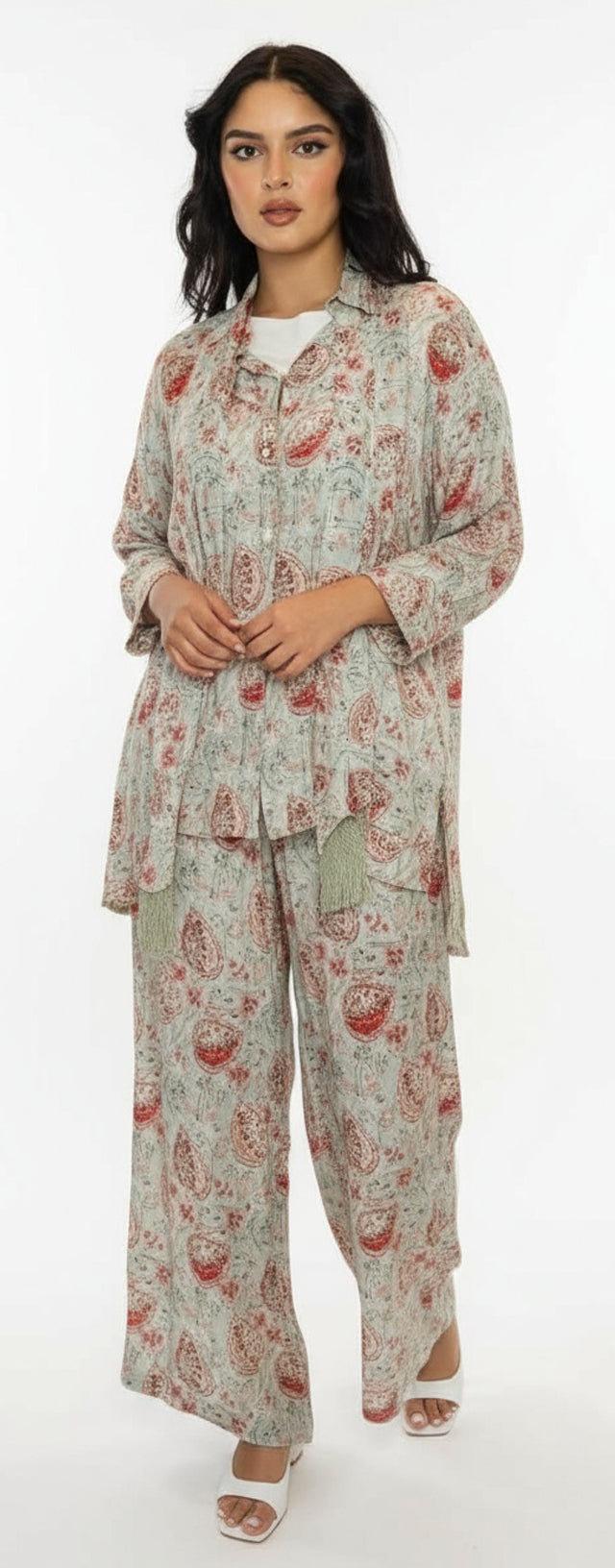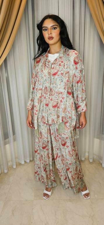 تايور بنطلون وبلوزه وسكارف تم شك اطرافه من قماش الحرير الياباني المطعم بالقطن عملي ومناسب للسفر او المناسبات العائليه