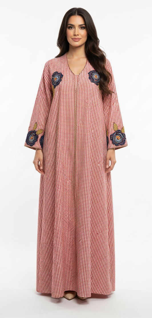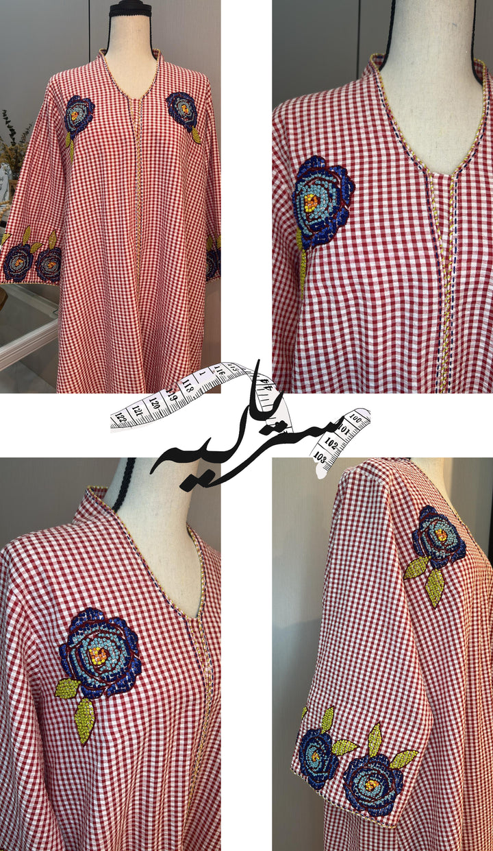 جلابية البكسل  بتطريز يدوي على شكل نقط  ليتشكل في النهايه زخرفه الروز يمكن صنعه بعده الوان ومقاسات مختلفه