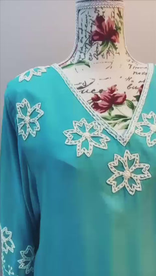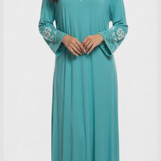 جلابيه من قماش جبانيز سيلك المطعم بالقطن من اللون التركواز الساده مشكوك يدويا