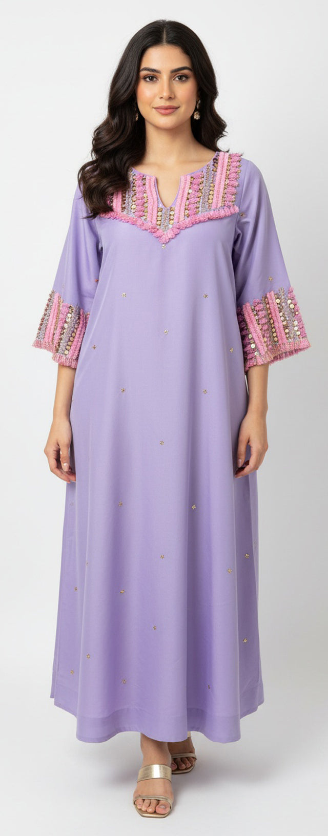 جلابيه من التفتا البنفسجي مع شك وتطريز يدوي في الصدر واليد