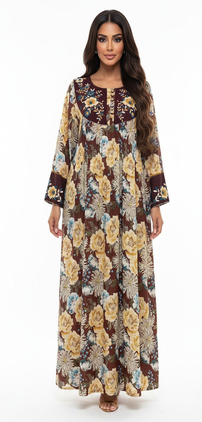 جلابيه من قماش الليبرتي مع قماش قطني ساده مشغول يدويا بخيوط التطريز والشك الناعم في اليد والصدر