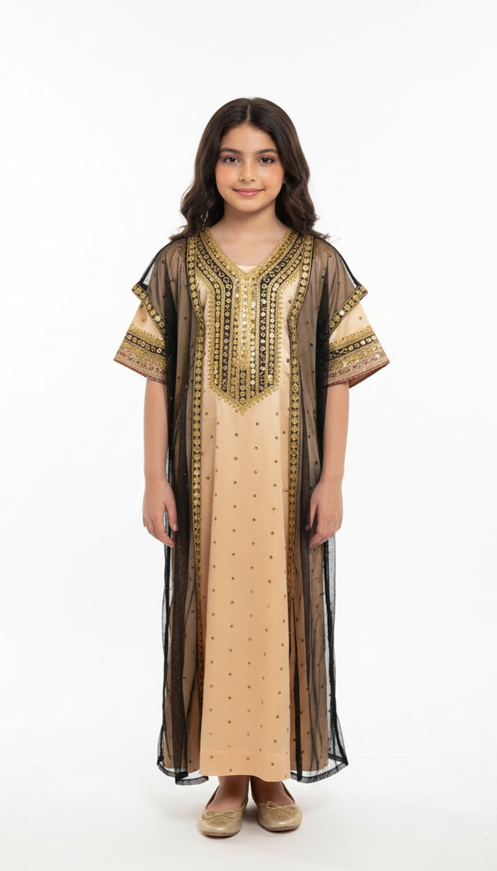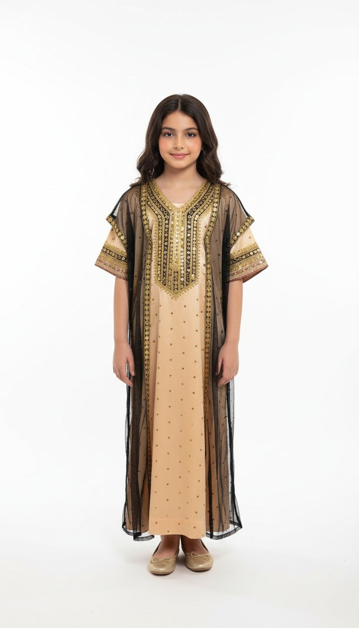 دراعه من التفتا المطعم بالزري لون البيج وتطريز بالصدر على قماش الشنتون وتول مطرز بتصميم خليجي جميل
