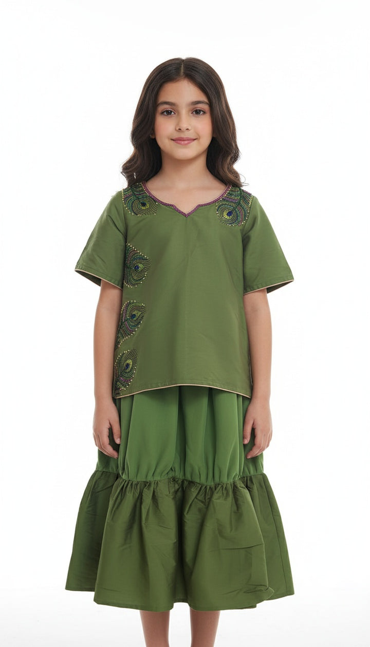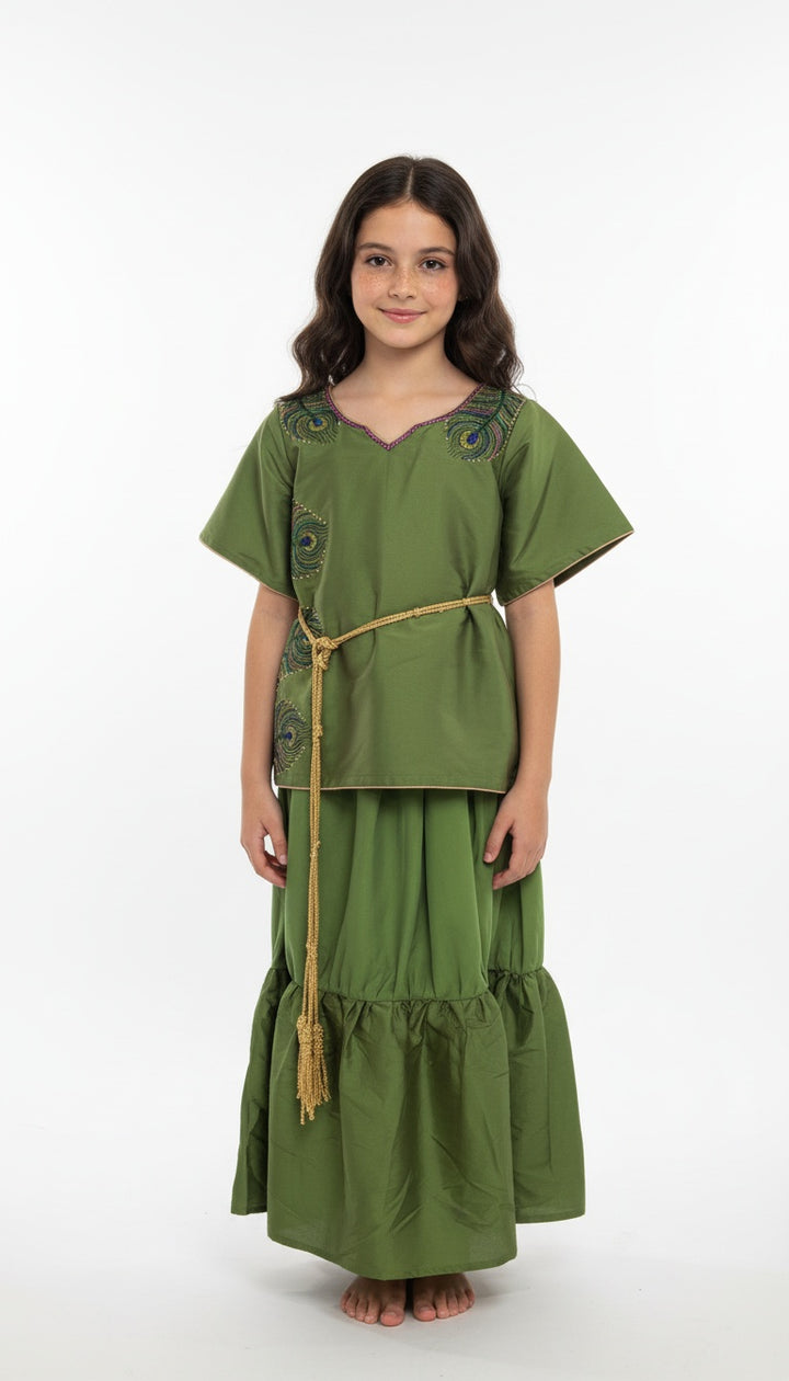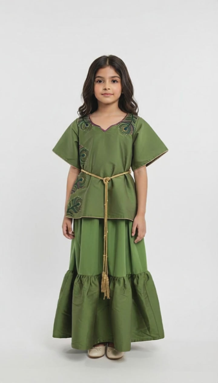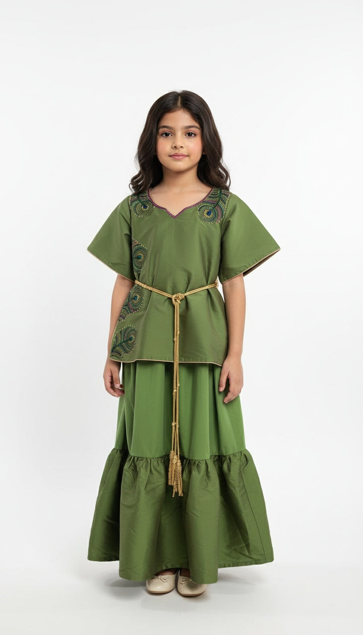 فستان الطاووس من التفتا اخضر المطرز يدويا مع طبقه من التول البنفسجي وحزام ذهبي يربط على الخصر