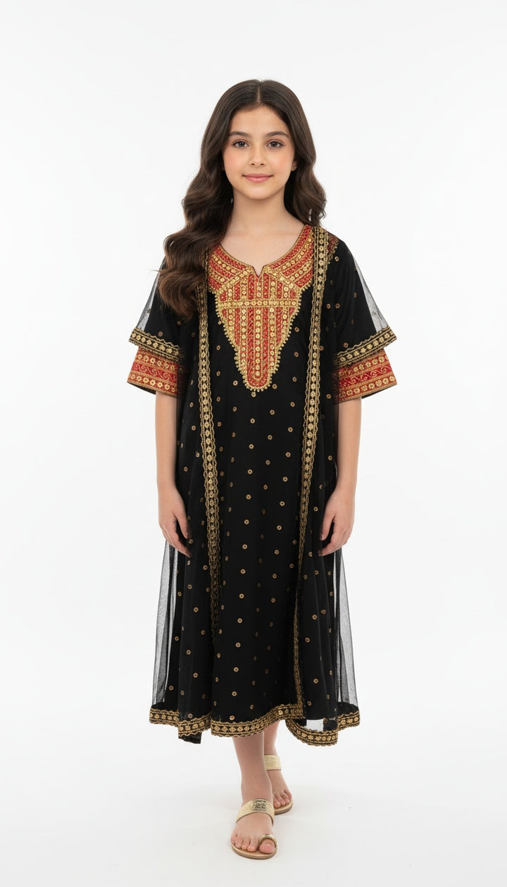 دراعه من االتفتا المطعم بالزري وتطريز ذهبي مع قماش شنتون احمر وتول اسود مطرز بالذهبي