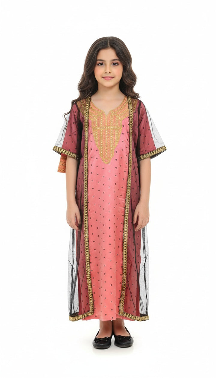 دراعه من التفتا المطعم بالزري لون الوردي الخلاب وتطريز بالصدر على قماش الشنتون وتول مطرز بتصميم خليجي جميل