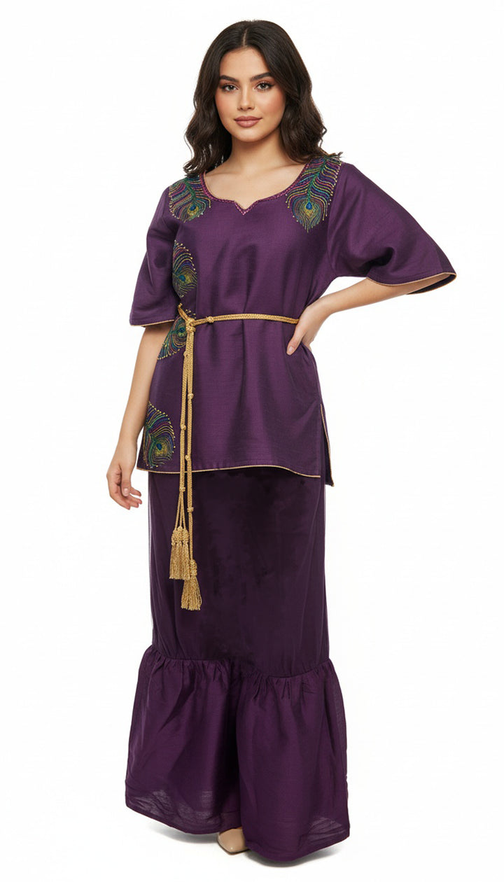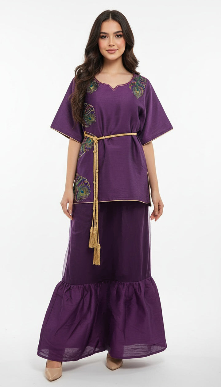 فستان الطاووس من الشنتون والتول مع شك يدوي وحزام من الخيوط الذهبيه يمكننا صنعه باي لون واي مقاس
