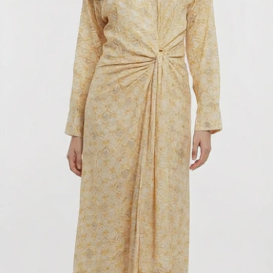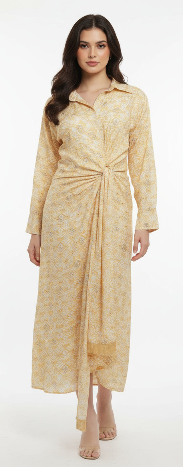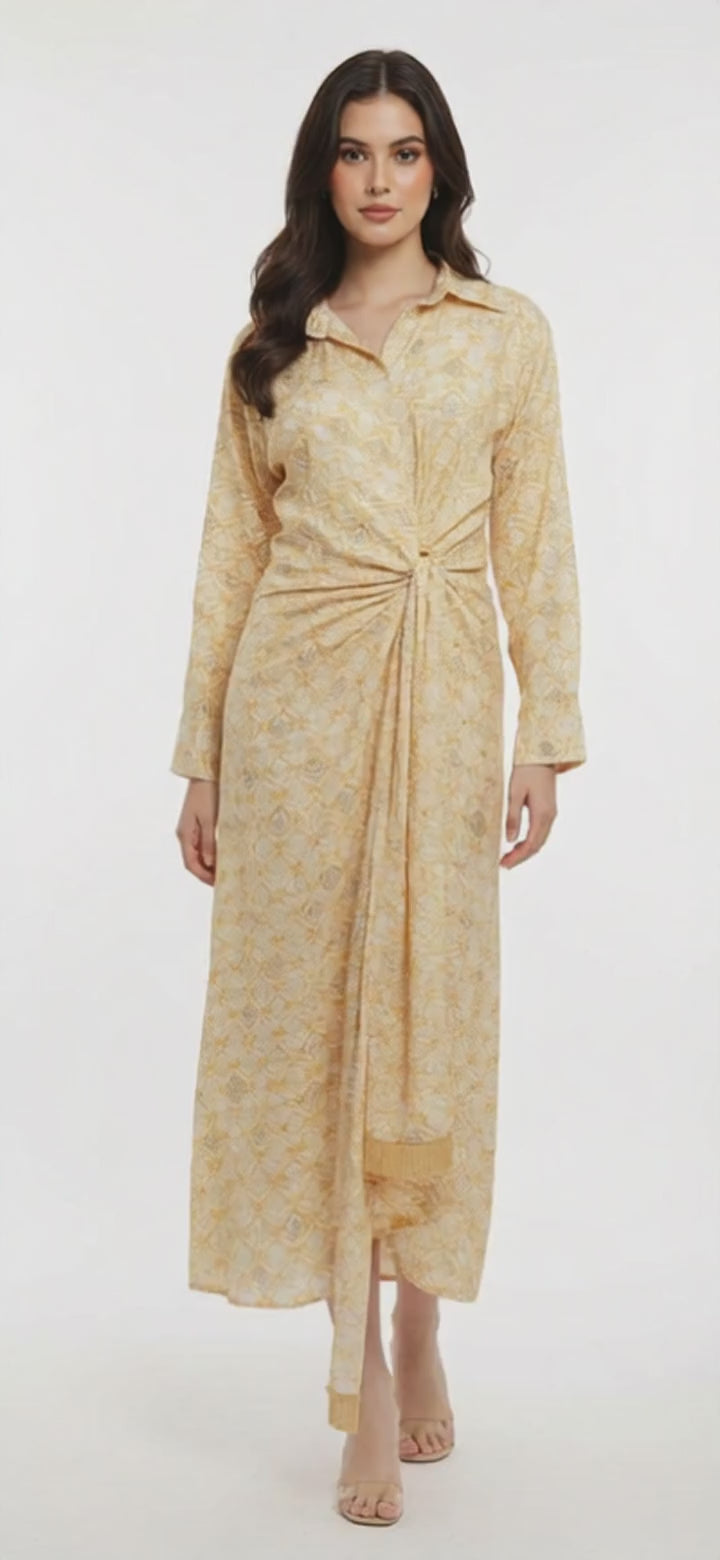 فستان ميدي من الحرير الياباني مع خيوط الشك في اليد واطراف الربطه راقي جدا ومن الممكن تخصيص القماش والمقاس