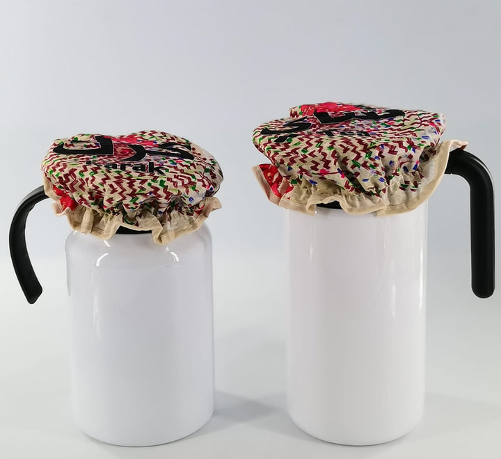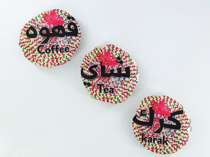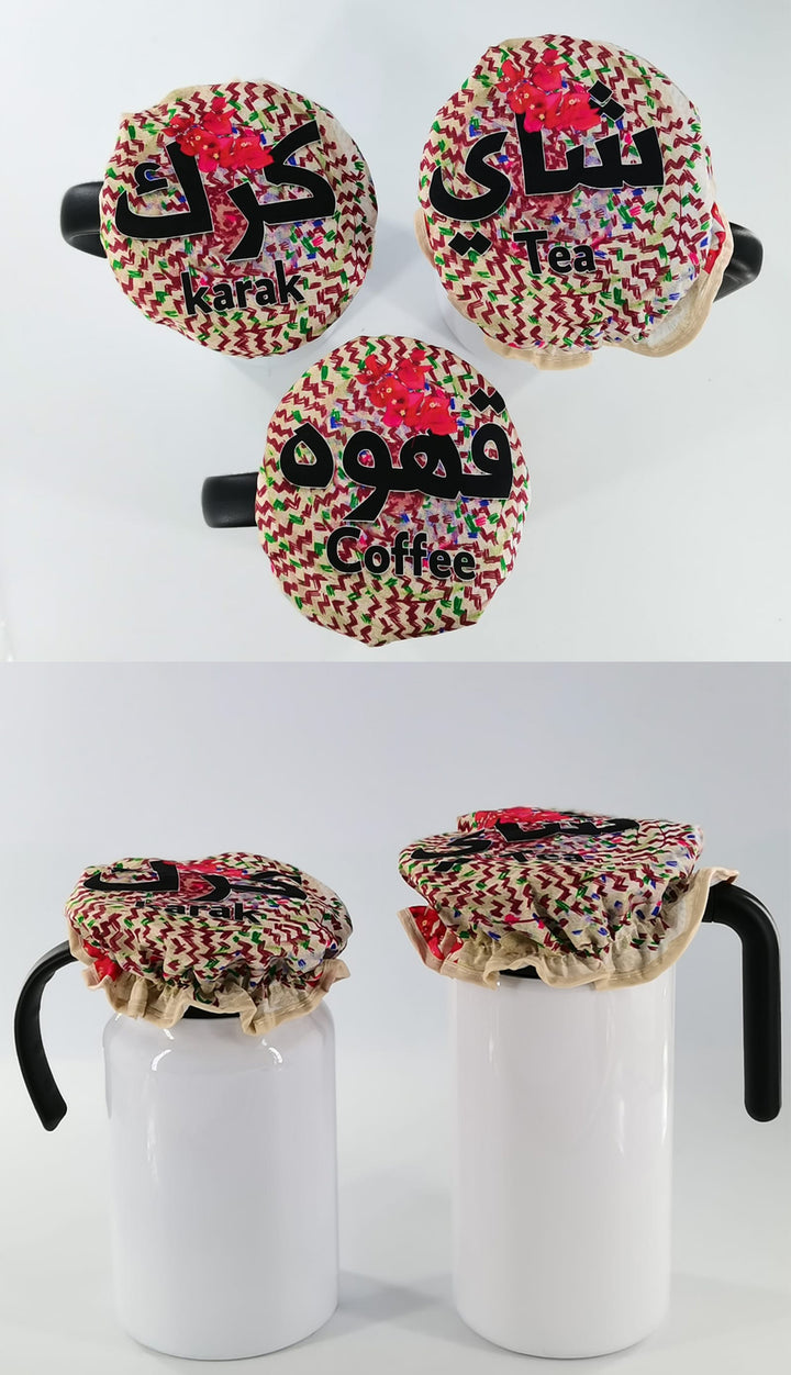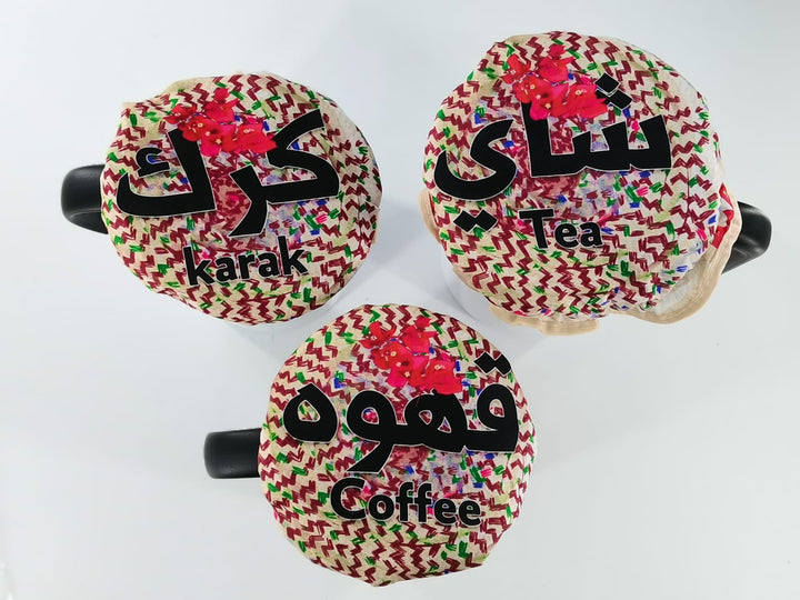 مجموعة من ٣ أغطية حافظات حرارية مزينة بنقش متموج بألوان حمراء وخضراء، مع زخارف نباتية وكتابات عربية. صممت هذه الأغطية لإضافة لمسة جمالية وحماية لأوعية المشروبات الساخنة والباردة. المميزات الرئيسية: • تتضمن المجموعة ٣ أغطية متناسقة • نقش متموج تقليدي باللونين الأحمر والأخضر • زخارف نباتية باللون الأحمر المشرق • كتابات عربية تشير للقهوة والشاي • غطاء واقٍ للأوعية الساخنة والباردة • عناصر تصميم شرق أوسطية أنيقة تجمع أغطية الحافظات الحرارية بين الوظيفة العملية والجماليات الشرق أوسطية التقليدية. يتميز كل غطاء بنقش متموج مميز باللونين الأحمر والأخضر على خلفية فاتحة، تكمله زخارف نباتية حمراء. الأغطية معنونة بخط عربي أنيق، مخصصة لتقديم القهوة والشاي. مثالية لإضافة لمسة زخرفية مع حماية وعزل أوعية المشروبات.